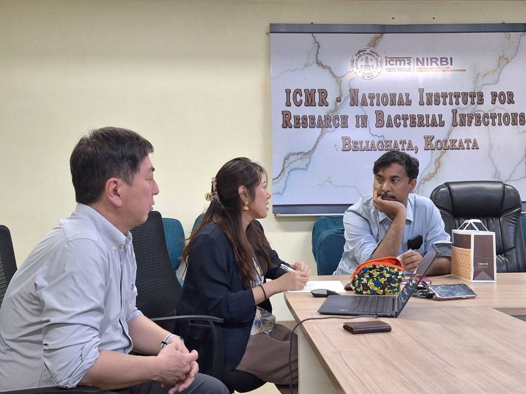 また、インド拠点のカウンターパートであるインド国立細菌感染症研究研究所(NIRBI)も表敬訪問され、所長のSantasabuj Das博士、および副所長のAsish Mukhopadhyay博士と面談されました。さらに、疫学部門のDebjit Chakraborty博士とは、インド国内の感染症サーベイランスに関して意見交換をされました。